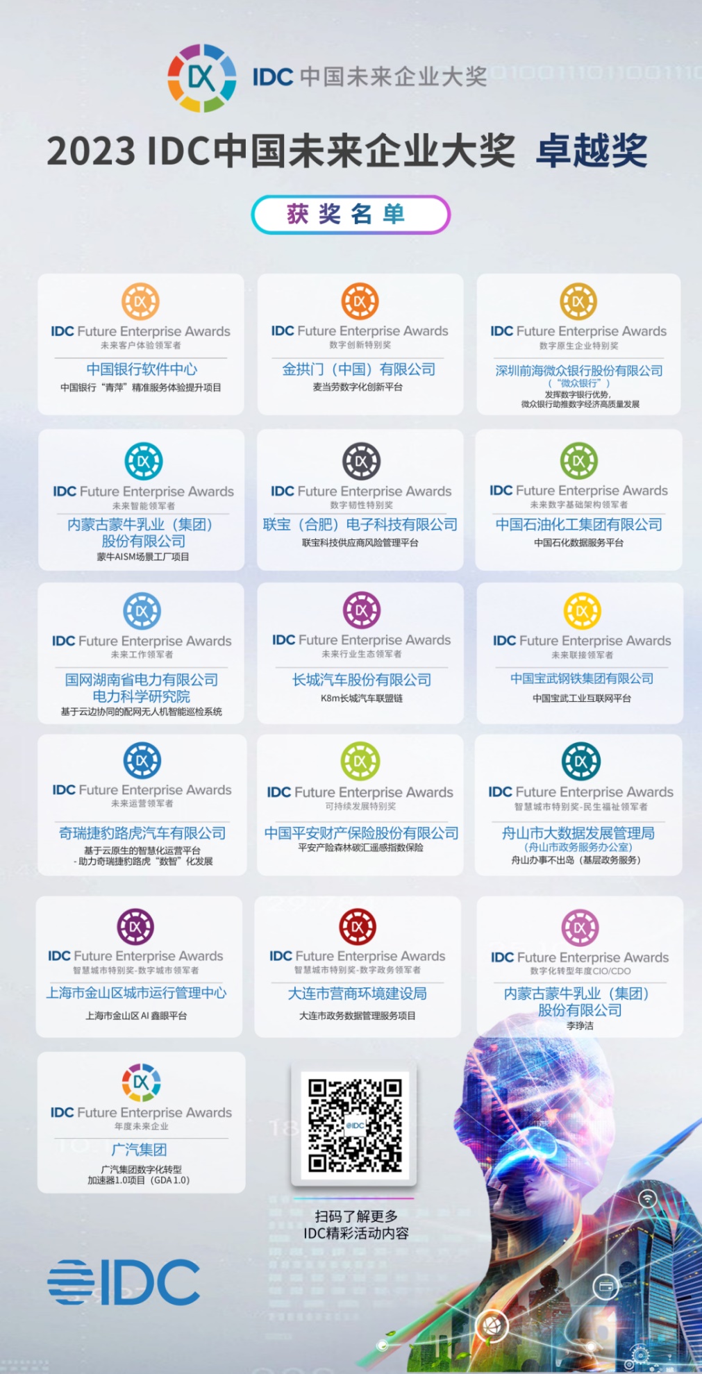 大会还荣耀官宣了“2023 IDC中国未来企业大奖——卓越奖”,获奖企业通过优秀实践,向与会嘉宾展示了他们在数字化转型的竞技游戏里是如何找寻到属于自己的“通关秘籍”并快速通关的实力。