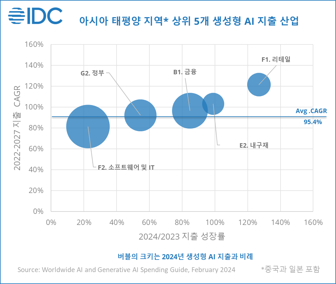 아태지역 생성형 AI 지출 2027년까지 연평균 95.4% 성장하여 260억달러 규모 형성 전망