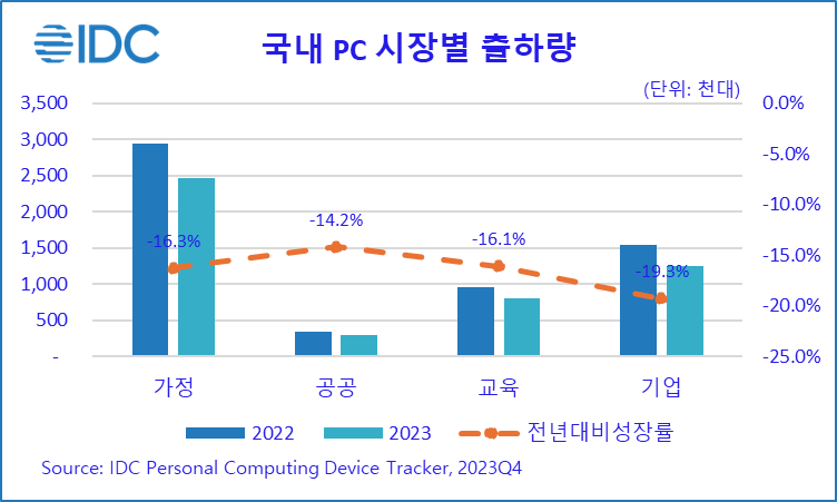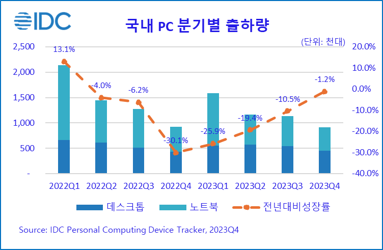 2024년 2월 16일, 서울 – IT 시장분석 및 컨설팅 기관인 인터내셔날데이터코퍼레이션코리아 (International Data Corporation Korea Ltd., 이하 한국IDC, 대표 한은선, https://www.idc.com/kr)는 최근 발표한 국내 PC 시장 연구 분석에서 2023년 국내 PC 시장은 전년 대비 17.0% 감소한 480만대를 출하했다고 금일 밝혔다. 온라인 수업 및 재택 근무 수요의 약화로 국내 PC 출하량은 2022년 2분기 이후 7개 분기 연속 감소하였지만, 탄력적인 채널 재고 운영과 디지털 교육 전환을 위한 노트북 보급, 노후화된 사무실 데스크톱 교체에 힘입어 낙폭은 점차 줄어드는 추세다. 2023년 4분기 기준 전세계 및 국내 시장은 전년 대비 각각 -1.8%, -1.2% 감소하여 시장 회복에 대한 기대감이 높아지고 있으며, 온디바이스 AI에 대한 사용자 관심은 PC 시장에도 긍정적인 모멘텀으로 작용할 전망이다.
