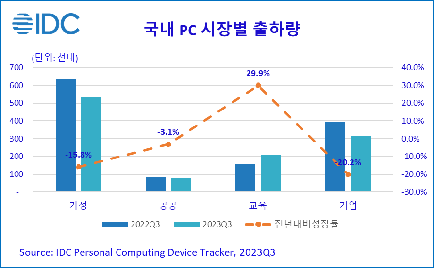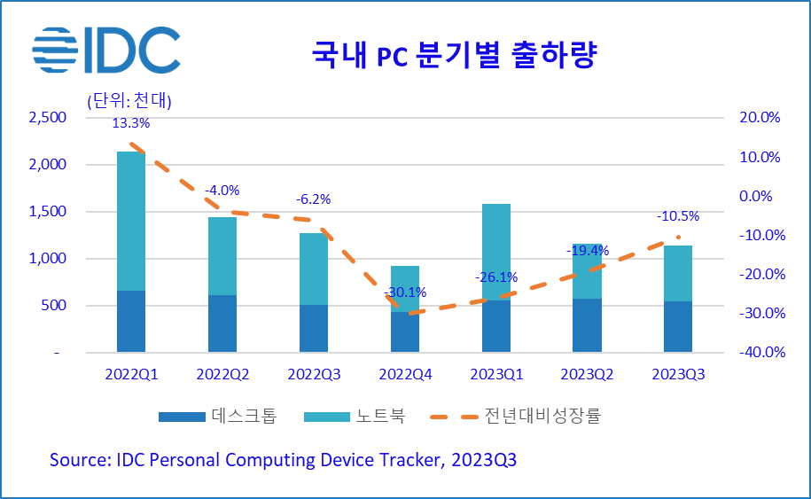 2023년 11월 14일, 서울 – IT 시장분석 및 컨설팅 기관인 인터내셔날데이터코퍼레이션코리아 (International Data Corporation Korea Ltd., 이하 한국IDC, 대표 한은선, https://www.idc.com/kr)는 최근 발표한 국내 PC 시장 연구 분석에서 2023년 3분기 국내 PC 시장은 전년 대비 10.5% 감소한 114만대를 출하했다고 금일 밝혔다.
