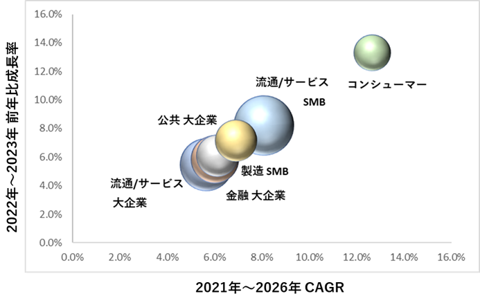 Note: バブルの大きさは2023年の支出額ベースの市場規模予測を示す