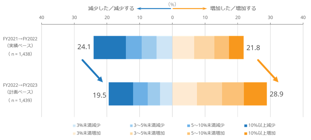 図1:2022年度(実績)、2023年度(計画)における年間IT予算の増減