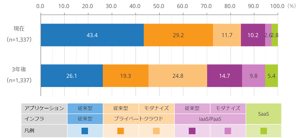 基幹システムの稼働環境に関する調査では、現状では、基幹システムのインフラストラクチャ(インフラ)の約57%がクラウド、モダナイズされたアプリケーションの割合は約27%となっています。3年後は、インフラのクラウド移行およびアプリケーションのモダナイゼーションいずれも進展しますが、特にアプリケーションのモダナイゼーションが進む見通しとなっています(図2)。