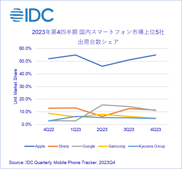 また、2023年通年の合計出荷数は、前年比11.0%減の3,001万台。ベンダー別シェアでは、アップルが1,558万台(シェア51.9%)でトップ、2位は326万台(同10.9%)のシャープ、3位は322万台(同10.7%)のGoogle、4位は188万台(同6.3%)のサムスン、5位は163万台(同5.4%)の京セラ、同位で162万台出荷のLenovo(同5.4%)となりました。