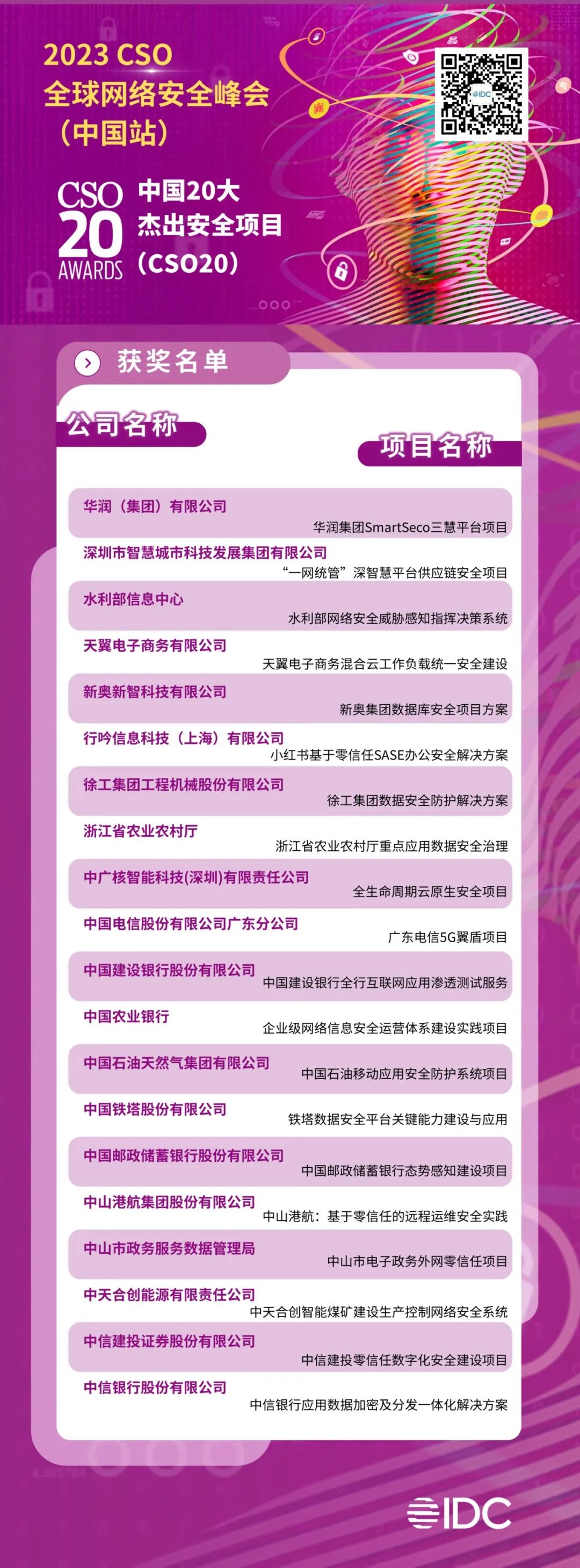 在2023全球CSO网络安全峰会(中国站)上,举行了“2023 IDC中国20大杰出安全项目(CSO20) ”和“2023 IDC中国 CSO名人堂 (十大人物) ” 颁奖仪式。