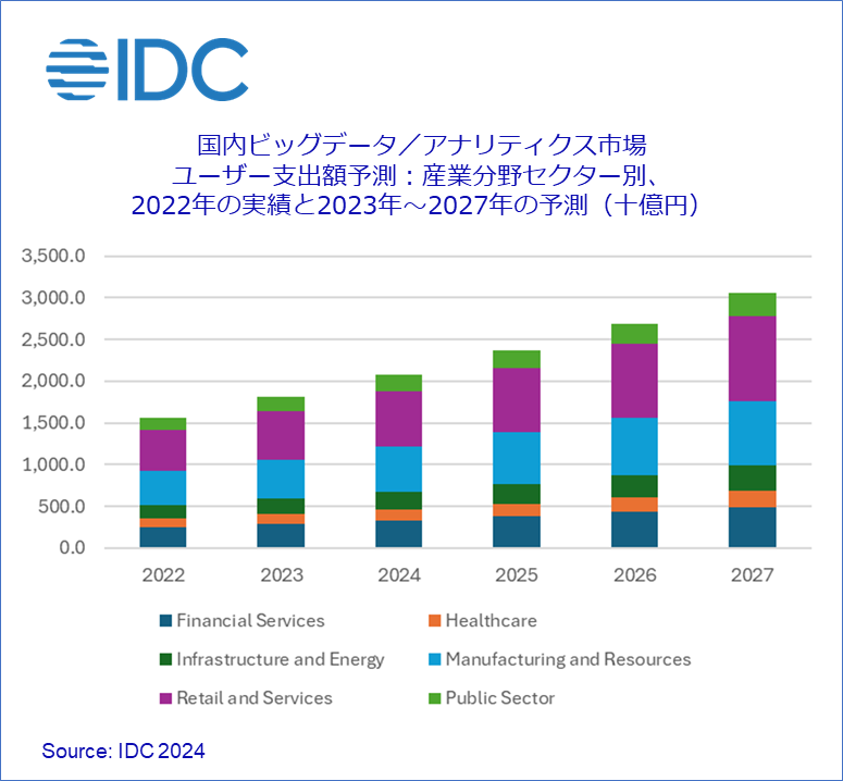 上記のような背景で、IDCでは国内ビッグデータ/アナリティクス市場支出額は2022年~2027年のCAGRは14.3%で成長し、2027年に3兆541億円に達すると予測しています。
