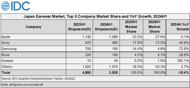 Earwear市場のトップシェア(27.6%)を占めるアップルが対前年比5.1%減、2位のソニー(シェア12.3%)が対前年比44.8%減と3位のSamsung(同4.8%)対前年比72.8%減、4位のBose(同4.0%)対前年比29.9%減など、国内市場のトップベンダーが対前年比減となりました。市場の成熟化とともに高価帯の製品より、同様の機能を持つ、より安価な製品にニーズは移行しています。