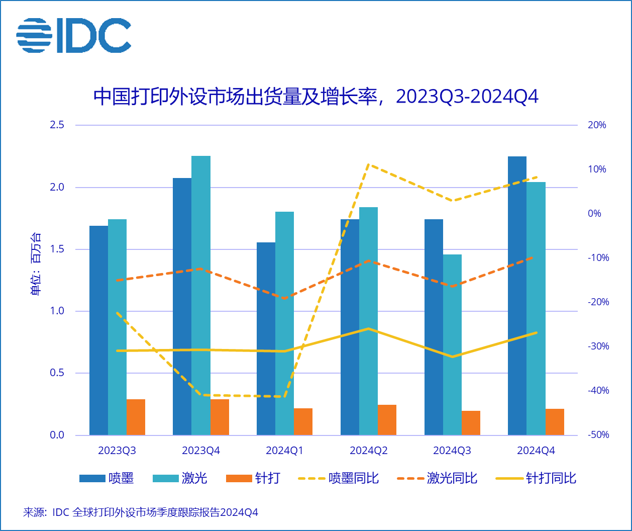北京,2025年3月24日——国际数据公司(IDC)最新发布的《全球打印外设市场季度跟踪报告(2024年第四季度)》显示,2024年中国打印外设市场出货量为1,530.8万台,同比下降12.5%。其中喷墨打印机出货量729.2万台,同比下降8.7%;激光打印机出货量714.3万台,同比下降13.8%;针式打印机出货量87.4万台,同比下降28.9%。受到经济环境不稳定,用户预算收紧和消费降级等因素的影响,打印机市场呈现持续两年的负增长。