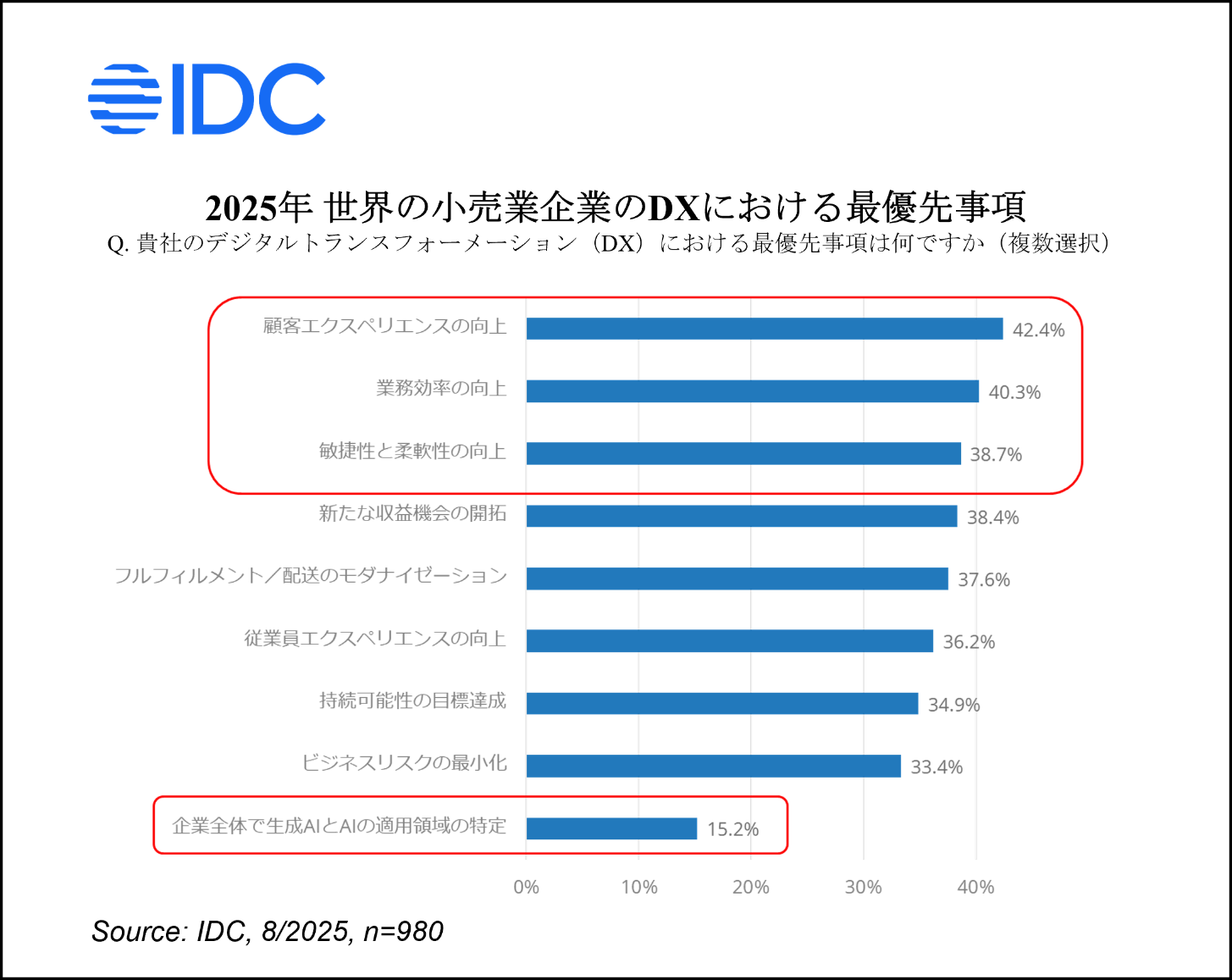 Japan, 2025年9月16日– IT専門調査会社 IDC Japan 株式会社(所在地:東京都渋谷区渋谷二丁目24番12号、代表取締役社長:村橋 俊介、Tel代表:03-6897-3812)は、昨年、世界の小売業企業(飲食業や宿泊業を含む)を対象にアンケート調査「IDC Global Retail Survey 2024(2024年 IDC グローバル小売業調査)」を実施し、その結果を発表しました。これによると(<参考資料>参照)、世界の小売業企業のデジタルトランスフォーメーション(DX)の最優先事項は、顧客エクスペリエンス(CX)の向上、業務効率の向上、敏捷性(アジリティ)と柔軟性の確保であることが明らかになりました。AIや生成AIの活用は、これらの目的達成に活用可能であると認識している一方、優先度は高くなく、持続可能かつ収益性の高い事業/業務運営を実現する取り組みが重視されています。