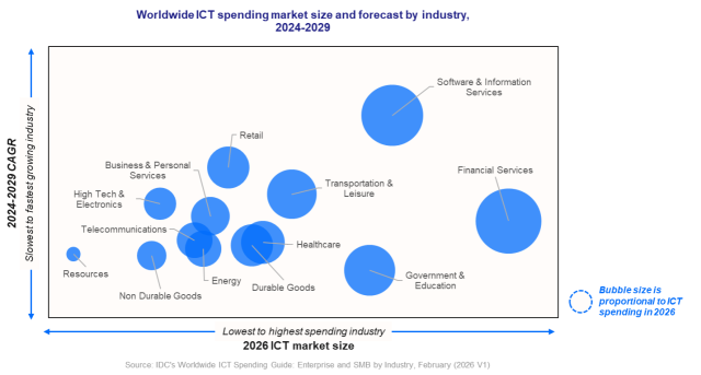 BOSTON, February 24, 2026 – Global spending on information and communications technology (ICT) is forecast to reach $4 trillion in 2026 and surpass $6 trillion by 2029, according to the latest update of the International Data Corporation’s (IDC) Worldwide ICT Spending Guide Enterprise and SMB by Industry. Excluding the consumer segment, the ICT market is projected to grow 10% in 2026, driven by rapid adoption of Artificial Intelligence (AI) platforms, which will grow over 70% by the end of the year.