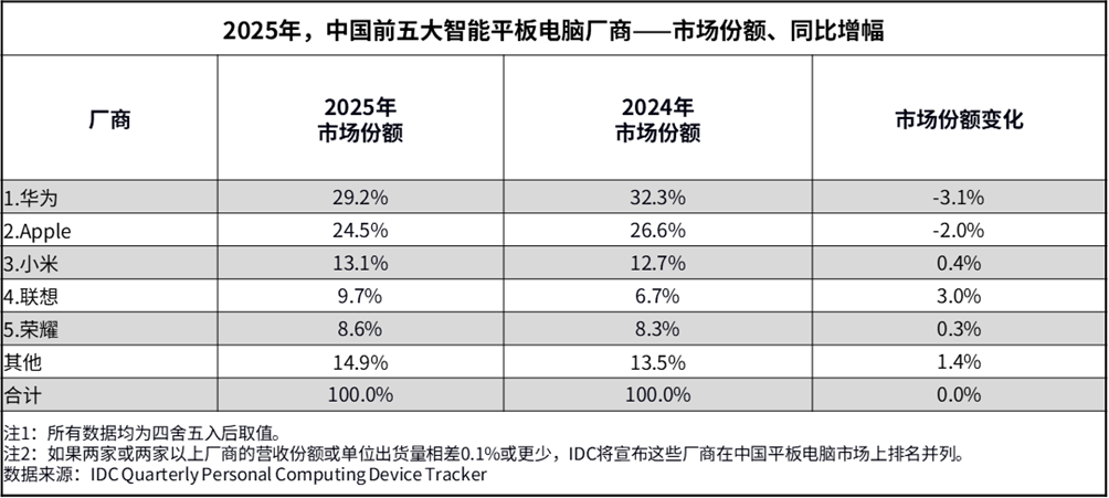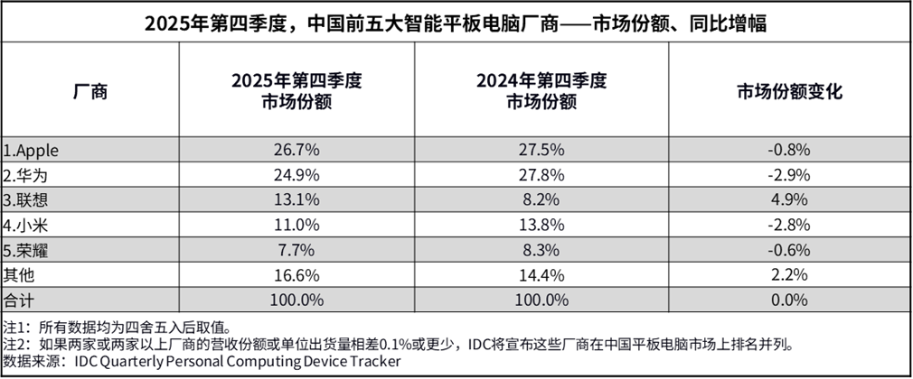 2025年第四季度及2025全年中国平板电脑市场出货量排名前五厂商市场表现如下:
