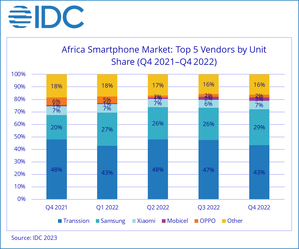 Rising inflation and growing macroeconomic issues continue to restrict consumer spending, causing vendors to be increasingly cautious with their shipments. Transsion brands (Tecno, Itel, and Infinix) led the region’s overall smartphone market in Q4 2022 with 43.4% unit share, spurred by its strong portfolio of entry-level devices. Samsung took second place with 28.7% share thanks to the strong performance of its A04 model. Xiaomi ranked third with 7.0% share. Transsion brands (Tecno and Itel) also dominated the feature phone landscape, garnering a combined unit share of 78.8%. Nokia ranked third in this space with 5.9% share.