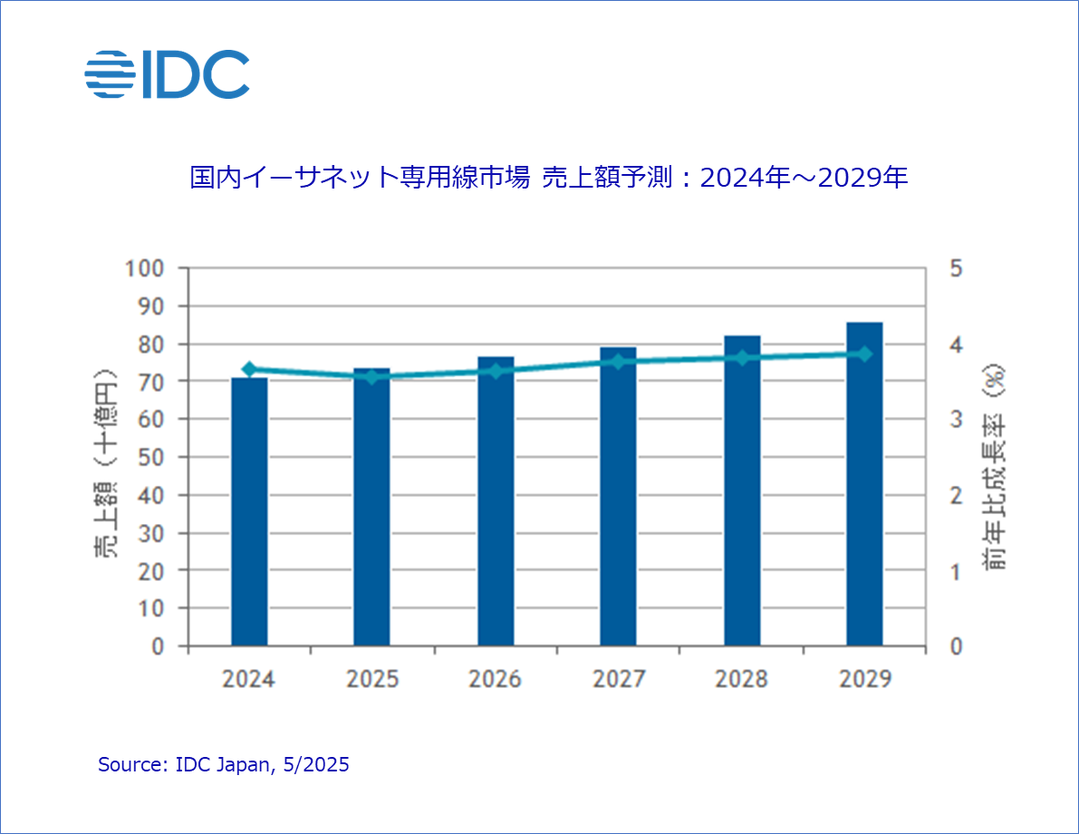 このようなことから、IDCでは、国内イーサネット専用線市場の市場規模は、2024年の714億円から年間平均成長率3.7%で成長し、2029年には858億円になると予測しています。イーサネット専用線市場は、広域イーサネットなどの閉域網サービス市場を上回るペースで成長し、WANサービス市場全体に占めるイーサネット専用線の構成比率は徐々に増加することが見込まれます。