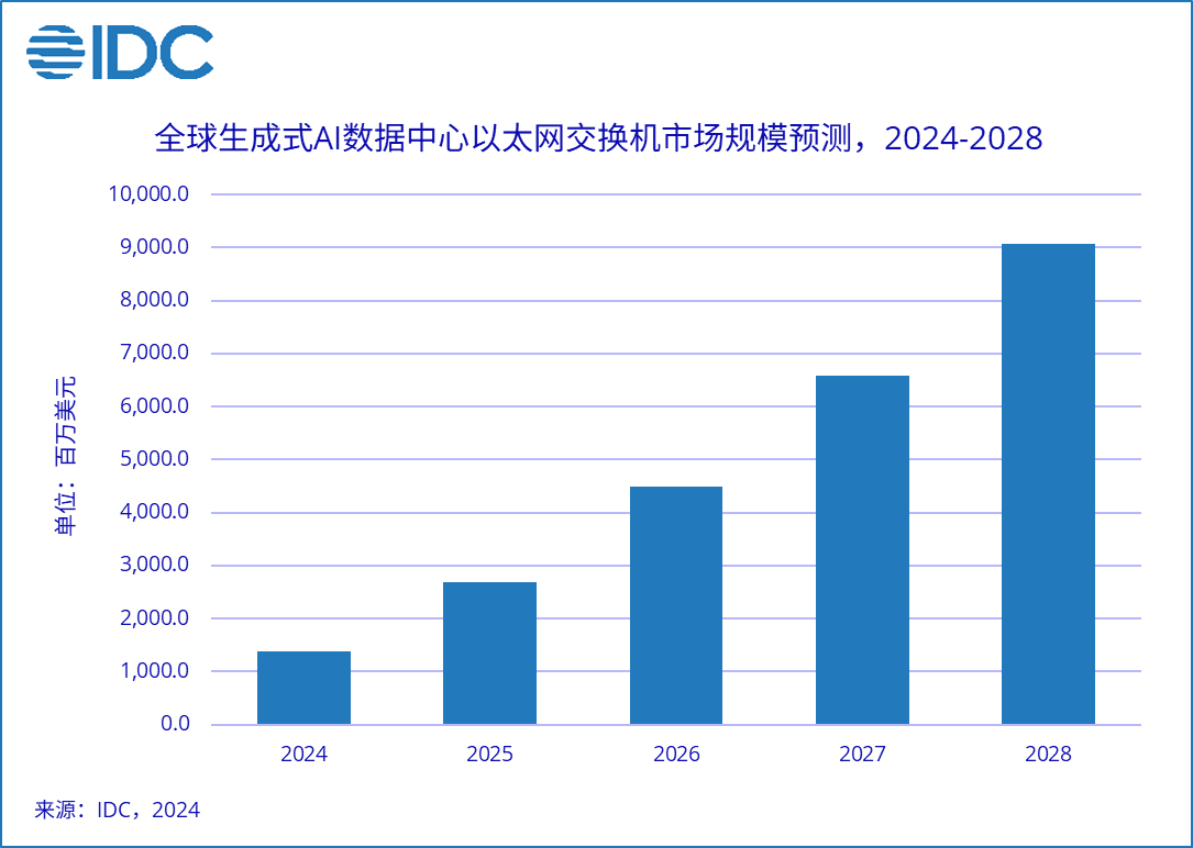 新一代AI以太网技术不仅保留了成本优势,还具备灵活性和开放性,并利用强大的以太网生态系统,成为AI时代的全新网络架构。AI以太网技术通过动态路由、智能调度和高级拥塞控制等创新,满足了AI应用对高带宽、低延迟和高可靠性的严苛要求,重塑了其在现代数据中心中的价值。随着网络设备商、AI芯片制造商以及互联网企业对以太网技术的持续投入,各种AI以太网技术百花齐放。IDC预测,生成式AI数据中心以太网交换机市场将以70%的年复合增长率呈指数级增长,将从2023年的6.4亿美元增长到2028年的90.7亿美元。