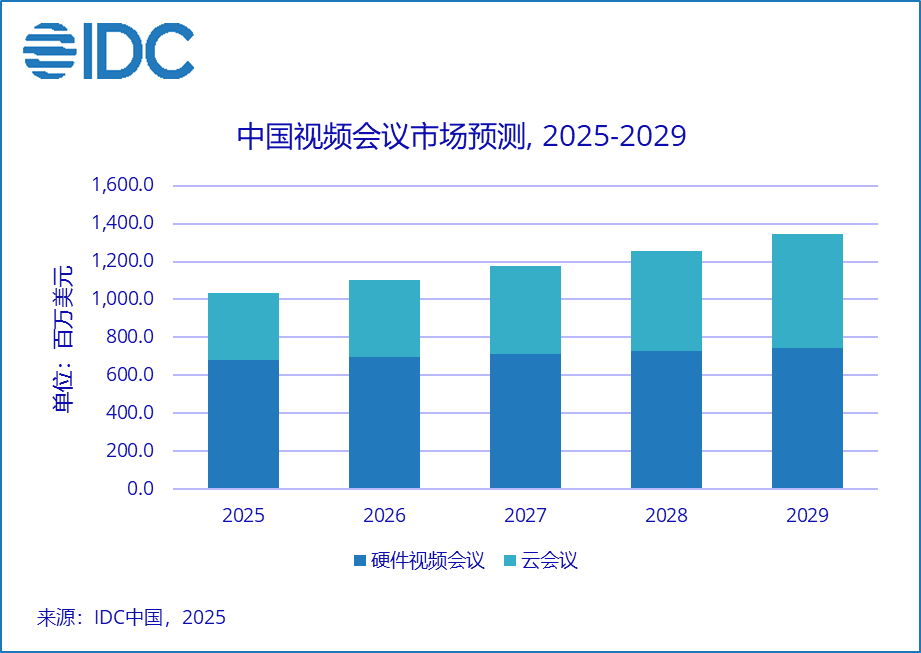 》(Doc# CHC52329525,2025年6月) 。IDC数据显示,2024年中国视频会议市场总体规模达到9.8亿美元(约合70.2亿元人民币),同比增长6.1%;其中,硬件视频会议市场在重大项目拉动下,规模达6.7亿美元(约合48.1亿元人民币),同比增长3.1%;云会议市场则在持续的商业化进程推动下,规模同比增长13.2%,达到3.0亿美元(约合22.0亿元人民币),保持了稳健增长态势。