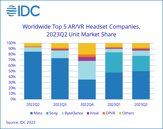 Meta’s status as the market leader has not changed as the company held 50.2% market share during the quarter. However, the company does face a challenge from Sony (27.1% market share) and ByteDance (9.6% share), each of which gained share in 2Q23. Rounding out the top 5 were Xreal (formerly Nreal) and DPVR, each of which had slightly more than 2% share.