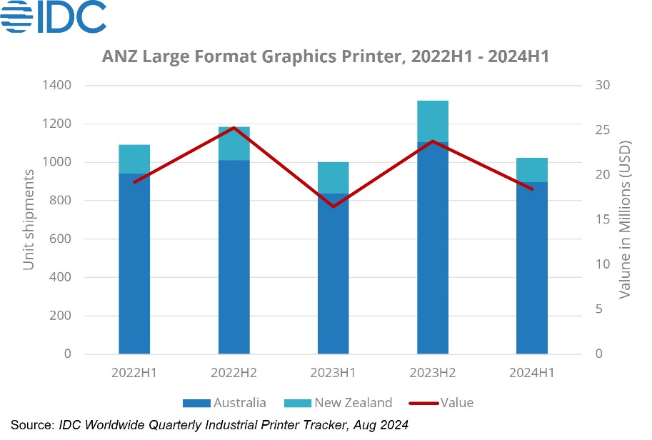 SYDNEY, 29 August 2024 – Based on the IDC Worldwide Industrial Printer Tracker, a total of 1,024 units of large format graphics printers were shipped in both Australia and New Zealand in the first half of 2024. This marked the second consecutive semi-annual which recorded YoY growth of 2.2%, but on a sequential growth basis, it was a 22.5% drop in unit shipments compared to 2023H2.