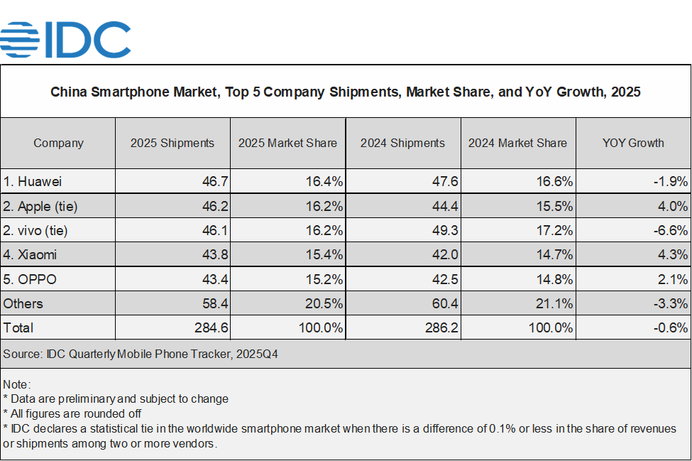 IDC: China Smartphone Market Declined 0.8% in 4Q25, With Apple Reclaiming the Top Spot with Double-Digit Growth