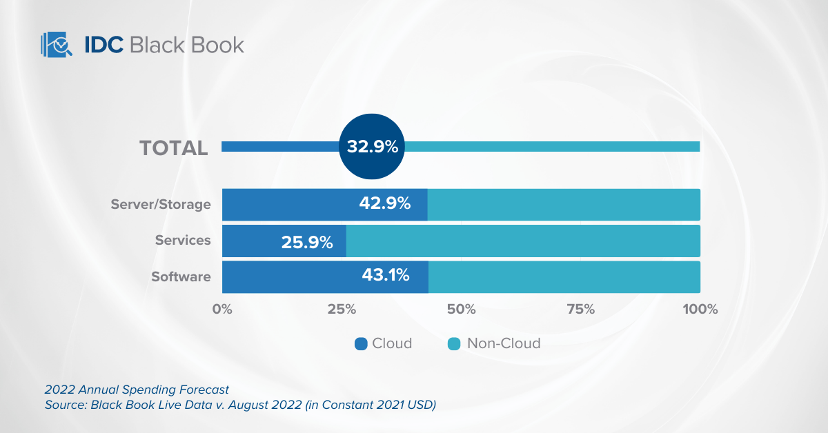 In contrast, despite the unfavorable macroeconomic environment, spending on software and security hardware in Europe is expected to stay relatively stable over the next few years. Cloud has emerged as a key technology for helping organizations increase their resiliency, and the latest version of the Black Book Live now includes a cloud spending view of the market., Overall cloud-related spending in Europe is forecast to constitute almost one-third of total technology spending in 2022, and its share will keep increasing over the next five years.