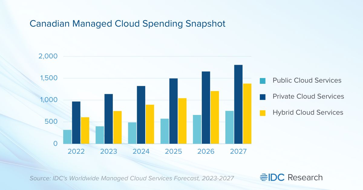 TORONTO, ON., August 15, 2023 — International Data Corporation (IDC) has released its latest forecast for the Canadian technology sector, outlining a projected increase in spending within the Canadian managed cloud services market. IDC predicts steady growth in this market despite economic challenges, highlighting Canada’s resilience and adaptability in the face of uncertainty. According to IDC’s projections, Canadian spending in managed cloud services is expected to grow from C$1.9 billion in 2022 to C$3.9 billion by 2027, reflecting a compound annual growth rate (CAGR) of 15.8% over the forecast period.