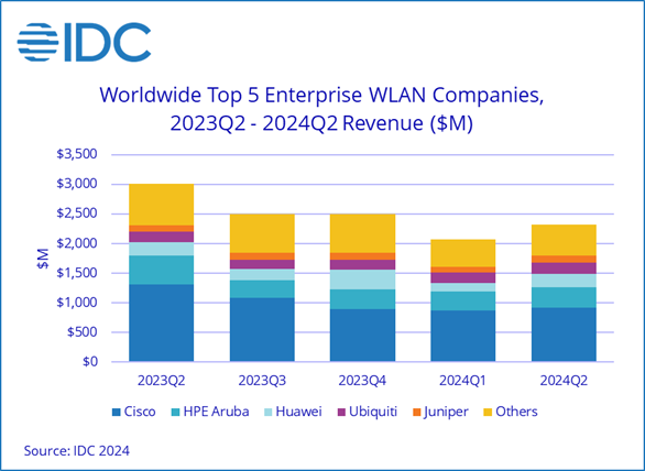 NEEDHAM, Mass., September 12, 2024 – The worldwide enterprise wireless local area network (WLAN) market grew revenues 12.4% between the first and second quarters of 2024 to $2.3 billion, according to results published in the International Data Corporation (IDC) Worldwide Quarterly Wireless LAN Tracker.