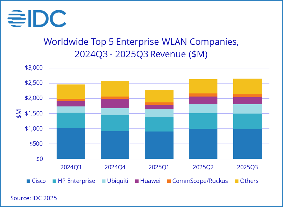 NEEDHAM, Mass., December 11, 2025 – The enterprise worldwide wireless local area network (WLAN) market grew 7.8% in the third quarter of 2025 (3Q25) compared to 3Q24 to reach $2.7 billion, building on the market’s growth momentum from the previous quarter, according to results published in the International Data Corporation (IDC) Worldwide Quarterly WLAN Tracker.