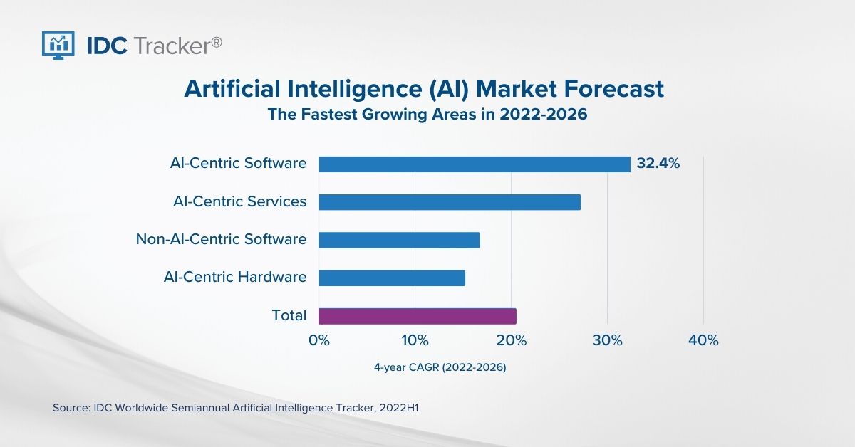 Prague, February 16, 2023 — Despite the war in Ukraine, inflation, IT budget cuts, and layoffs announced by even the biggest tech companies, International Data Corporation (IDC) estimates that the artificial intelligence (AI) market, including software, hardware, and services, will post a compound annual growth rate (CAGR) of 25.5% in the 2022-2026 period to reach $191 billion in 2026. This data was published in the latest update of the IDC Worldwide Semiannual Artificial Intelligence Tracker. IDC expects that growth will mainly be driven by AI-centric software (CAGR 32.4%), while growth will be significantly lower in AI services (CAGR 27.2%), non-AI-centric software (CAGR 16.7%), and AI hardware (CAGR 15.2%).