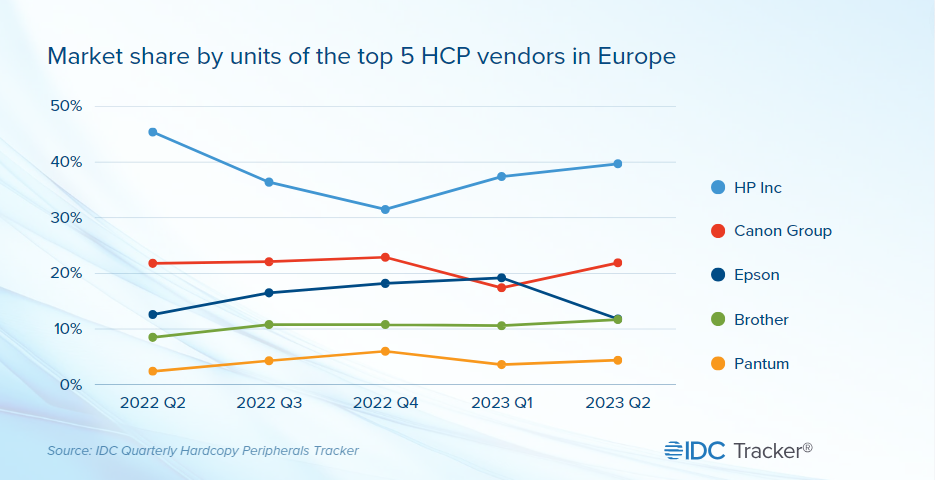 The top 5 vendors in terms of units on the European market remained unchanged from the previous year: HP Inc., Canon, Epson, Brother, and Pantum (in order). Out of those brands, Brother gained 3.2 percentage points in unit market share year on year due to enhanced product availability, which allowed the vendor to consistently resupply its channel.