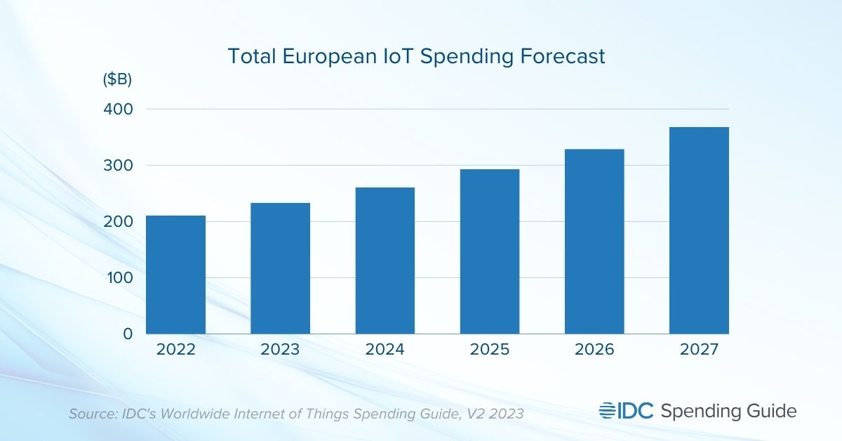 MUNICH, January 23, 2024 — According to the latest release of the Worldwide Internet of Things Spending Guide published by International Data Corporation (IDC), European organizations are projected to invest approximately $260 billion in Internet of Things (IoT)-related solutions in 2024. IDC predicts that IoT spending growth will gradually pick up momentum in 2024 and beyond with the recovery of the European economy, recording a five-year compound annual growth rate (CAGR) of 11.8% and reaching almost $368 billion by 2027.