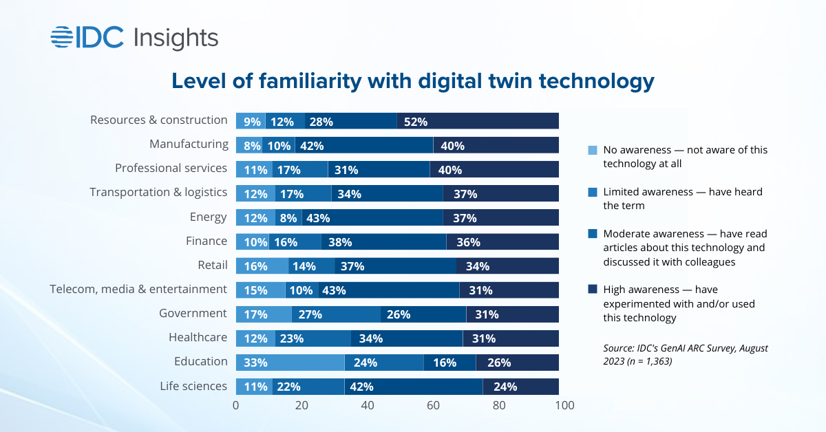 IDC research highlights the widespread adoption and recognition of digital twin technology across various sectors, extending its reach far beyond the traditional, asset-heavy industries. A comprehensive survey conducted by IDC reveals notable familiarity with digital twins in resources and construction (52%) and manufacturing (40%), but also in professional services (40%), transportation and logistics (37%), energy (37%), and finance (36%). This broad applicability underscores the technology’s role in enhancing operational efficiency and decision-making in cross-industry ecosystems.