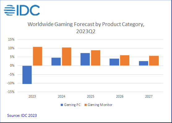 As the market struggles in the near term, improvements are expected in 2024 and beyond with gaming PCs achieving a 4.6% compound annual growth rate (CAGR) between 2023 and 2027. Gaming monitors are forecast to have a 7.7% CAGR during the same period.
