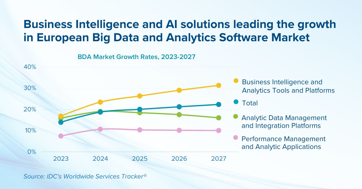 According to IDC’s Big Data and Analytics (BDA) Software Forecast, the European outlook is predicted to improve, with 14% growth in 2023 (current currency) and an upward trend in the following years, resulting in a compound annual growth rate (CAGR) of 20.8% for WE and 19% for CEE in the 2023–2027 period. Uninhibited growth of data analytics and AI solutions will subsequently drive demand for business intelligence and analytics tools and platforms, thus leaving the other two markets significantly behind.