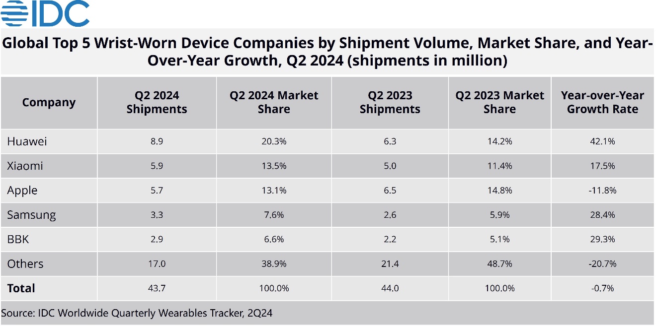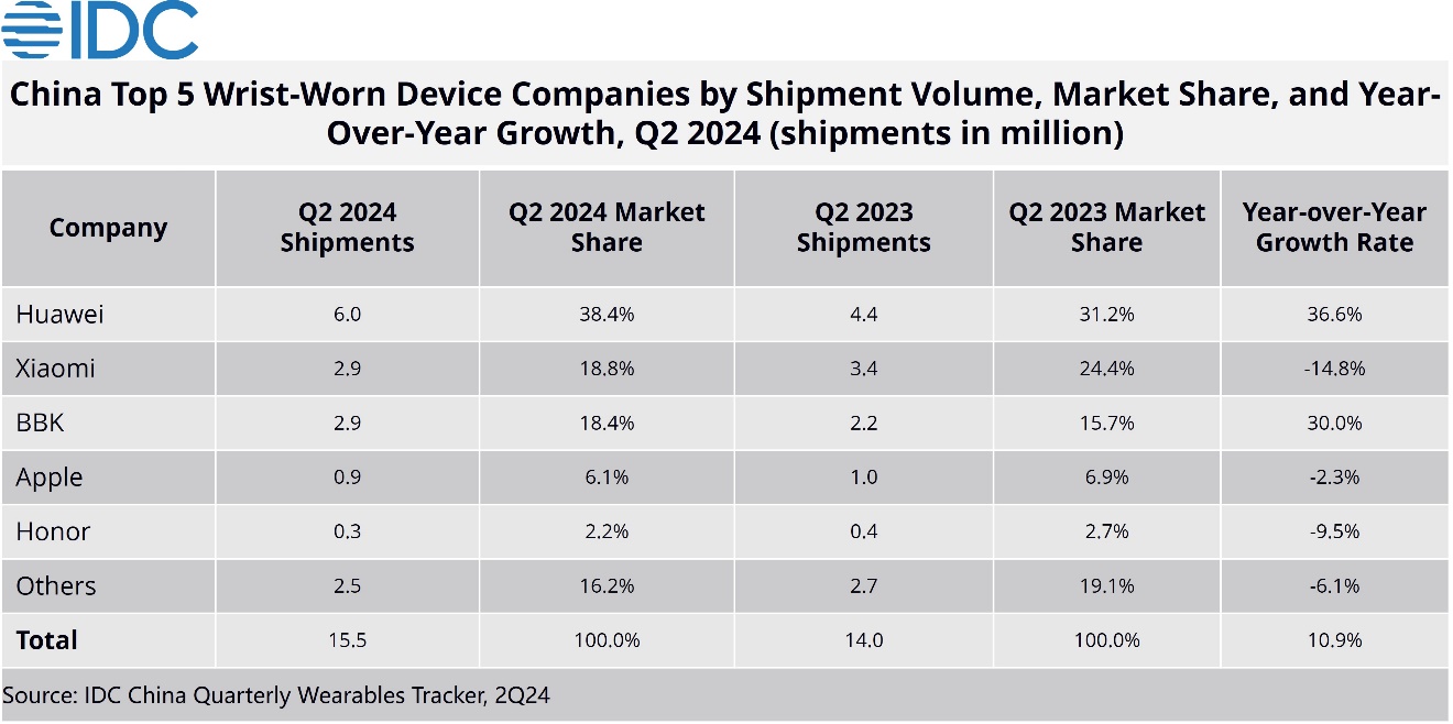 BEIJING, 05 September 2024 – According to the latest International Data Corporation (IDC) Worldwide Quarterly Wearable Device Tracker data, the global wrist-worn device market shipped 43.7 million units in the second quarter of 2024 (2Q24), a year-over-year (YoY) decrease of 0.7%. China significantly outpaced the global wrist-worn device market with 15.5 million units shipped, a YoY increase of 10.9%.