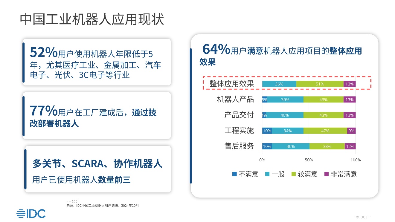 - 目前,用户对工业机器人应用项目的整体效果满意度64%,其中在工程实施、售后服务方面的不满意度10%。