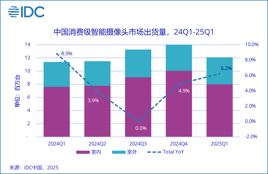 北京,2025年6月25日——国际数据公司(IDC)最新发布的《全球智能家居设备市场季度跟踪报告,2025年第一季度》显示,2025年第一季度全球智能摄像头市场(包含消费级室内和室外摄像头,含运营商渠道)出货3386.6万台,同比增长4.6%,增速持续放缓。其中亚太(不含中国及日本)、拉美市场分别增长23.1%及19.6%,是全球增长最快的两个区域,新兴市场的消费摄像头增长主要由线上渠道拉动。