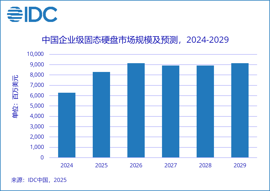 北京,2025年5月28日——近日,国际数据公司(IDC)发布了最新的《中国半年度企业级固态硬盘市场(2024下半年)跟踪》报告。IDC数据显示,中国企业级固态硬盘市场在2024年得到修复,市场规模达到62.5亿美元,与2023年相比增长187.9%。IDC预计,2029年中国企业级固态硬盘市场规模将达到91亿美元。