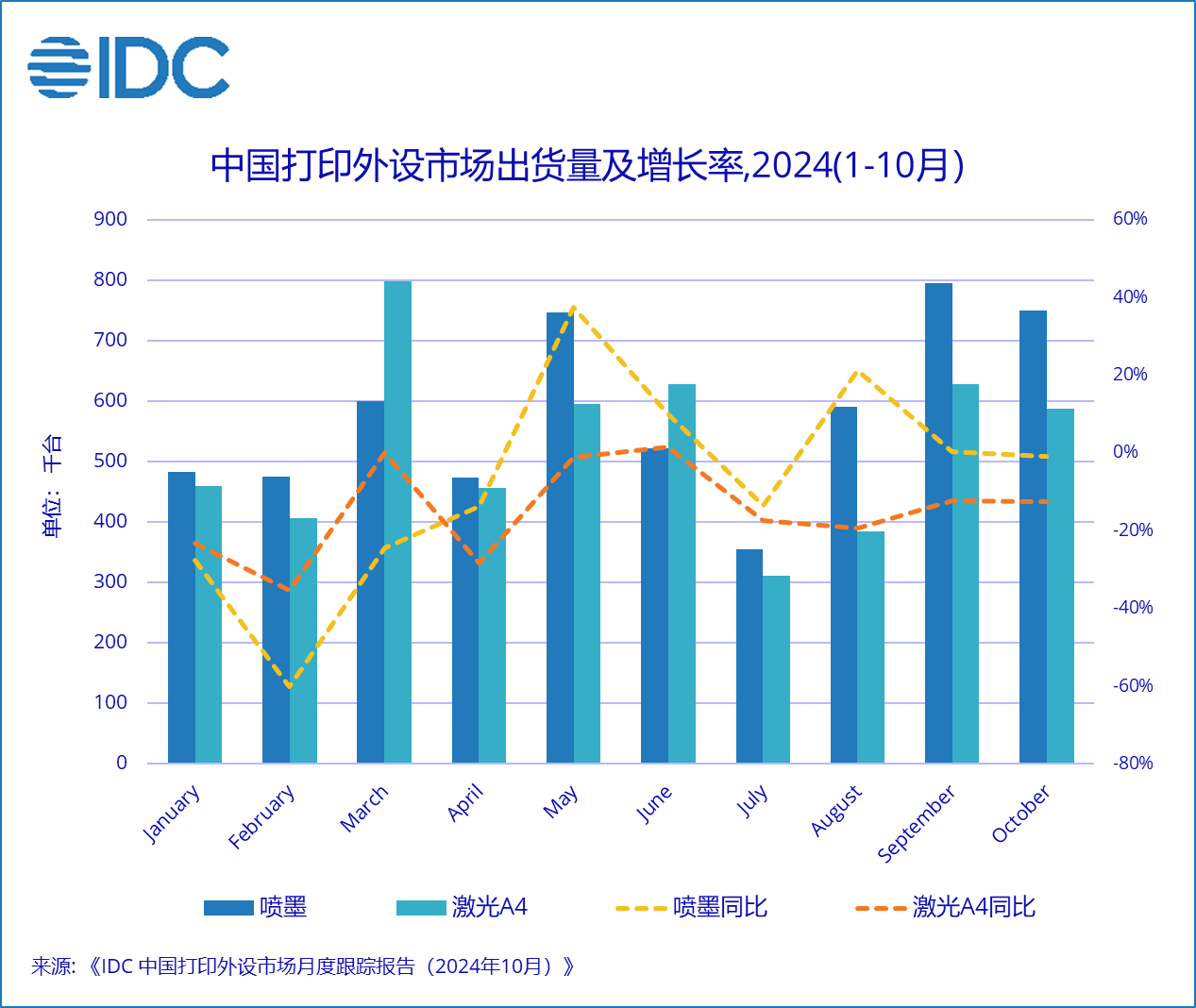 北京,2024年12月2日——国际数据公司(IDC)最新发布的《中国打印外设市场月度跟踪报告(2024年10月)》显示,截止到2024年10月,中国打印外设市场出货量(不含A3激光)为1104.6万台,同比下降13.6%。其中喷墨打印机出货量579.1万台,同比下降13.1%;激光A4打印机出货量525.4万台,同比下降14.2%。经济持续处于下行周期,用户消费降级是影响今年出货量同比大幅下滑的主要原因。