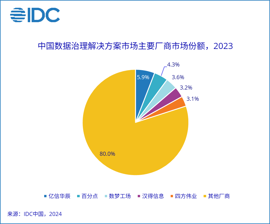 2023年中国数据治理解决方案子市场规模达30.82亿元人民币,相比2022年增长7.8%。在本次报告中,亿信华辰、百分点、数梦工场仍然位居市场前三。汉得、四方伟业分别占据3.2%以及3.1%的市场份额。在该市场中,除了头部几家跨行业耕耘的数据治理解决方案商,在各个行业中也培育了大量专耕单个行业的优秀的数据治理解决方案商。