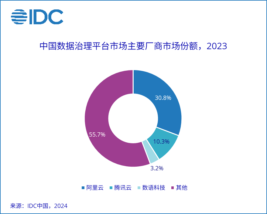 2023年,中国数据治理平台级市场规模达29.3亿元人民币。相比2022年,整体市场增长9.1%。数据要素、数据资产入表政策起到一定的推动作用,但对于市场规模的实际影响较弱。本年度,IDC在该市场的市场份额中收录了阿里云、腾讯云、数语科技3家厂商。