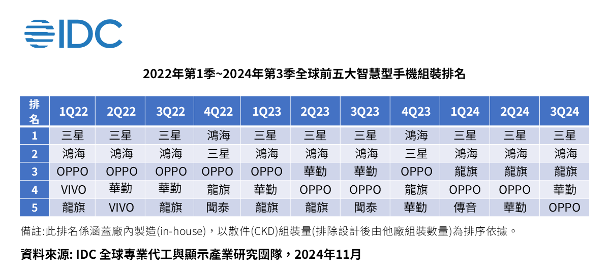 IDC全球專業代工與顯示產業研究團隊資深研究經理高鴻翔 指出:「隨著庫存積壓、政策補貼等零組件殺價競爭背景因素逐步減少,智慧手機超低階市場區隔競爭漸告一段落。苦於中階市場需求減少而於2024上半年市占率消退的廠商,紛紛透過增加委外代工提高價格競爭力,試圖奪回市場佔有率。」從生產結構來看,2024年第三季全球智慧手機產業委外設計外包的比重從第二季的46.9%進一步提升至49.8%,5G授權範圍亦已從一線代工廠擴及至二線代工廠。