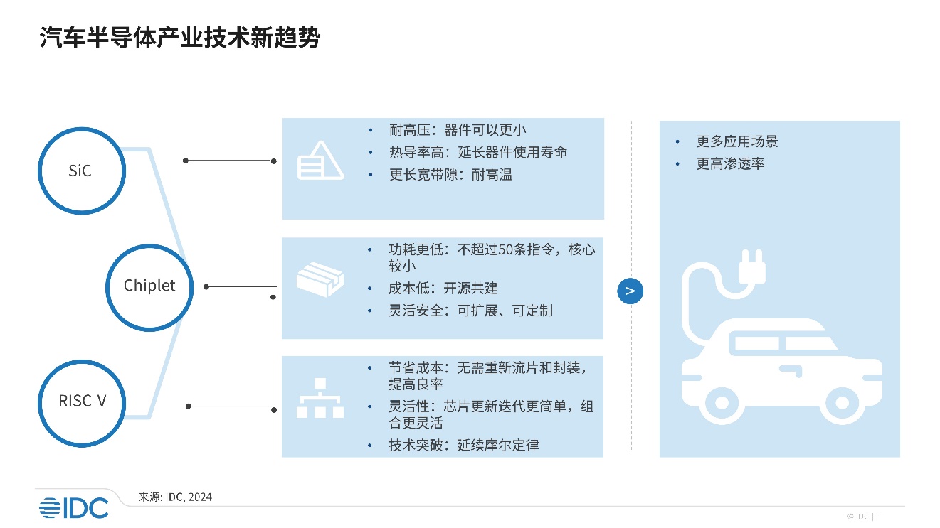 国际数据公司(IDC)于近日发布了 《Technology Trends of Automotive Semiconductors》(Doc# US51536724,2024年9月) 报告。主要分析了SiC、Chiplet、RISC-V的优势和潜在的应用机会。