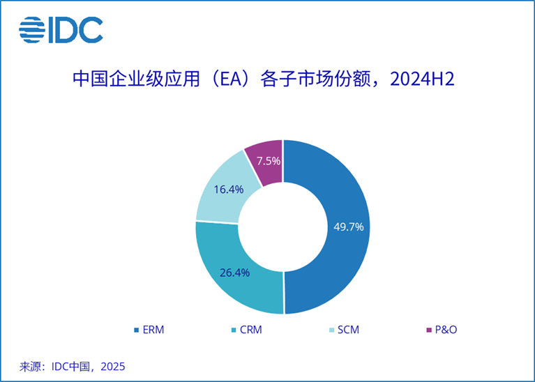 根据 IDC 定义,中国企业级应用(EA)市场分为企业资源管理(ERM)、客户关系管理(CRM)、供应链管理(SCM)和生产与运营(P&O)四大子市场。其中,企业资源管理(ERM)和客户关系管理(CRM)市场以 49.7% 和 26.4% 的市场份额驱动整体市场快速发展: