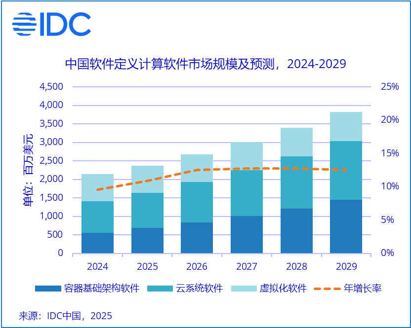 北京,2025年6月6日—— IDC最新发布的《中国软件定义计算软件市场半年跟踪报告,2024H2》显示,2024年中国软件定义计算软件市场的市场规模达到了21.4亿美元,同比增长9.6%;其中,虚拟化软件市场、云系统软件市场和容器基础架构软件市场的规模分别达到了7.3亿美元、8.5亿美元和5.6亿美元。未来五年该市场的年复合增长率将达到12.3%,容器基础架构市场是三个市场中增长最快的市场,2029年的市场规模预计达到14.6亿美元。