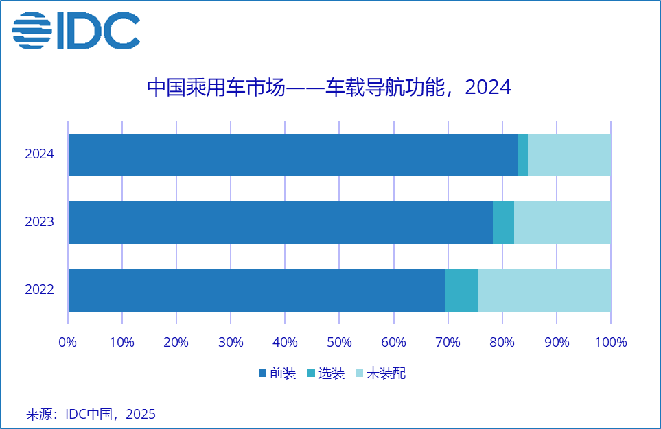 导航软件已成为消费者出行过程中不可或缺的助力,消费者即使在熟悉的路线中亦常常开启导航功能获取实时路况或其它辅助信息。IDC数据显示,车端前装导航功能的比例亦在近几年不断提升,至2024年已超过80%。导航信息是人车交互界面中的关键信息,高水平的通信能力能够实现实时数据交换和连接,从而提高导航精度、效率和用户体验。
