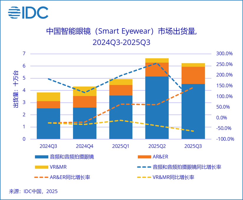 2025年第三季度中国智能眼镜(Smart Eyewear)市场出货量62.3万台,同比增长62.3%。