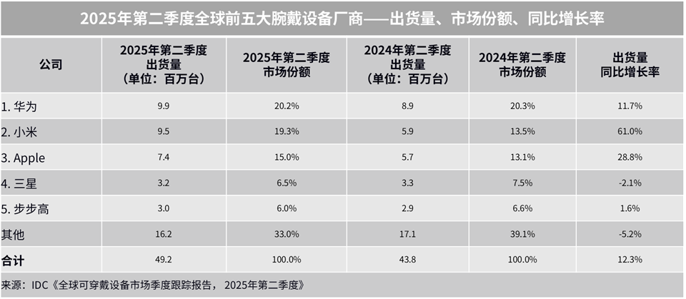 北京,2025年9月9日——根据国际数据公司(IDC)最新发布的《全球可穿戴设备市场季度跟踪报告》,2025年第二季度全球腕戴设备市场出货4,922万台,同比增长12.3%.其中,中国作为全球最大腕戴设备市场,二季度迎来“国补”和“618”双重助力,出货量为2,080万台,同比增长33.8%,增速领跑全球。此外,美国和西欧市场迎来逐步复苏,拉美作为新兴市场保持增长。