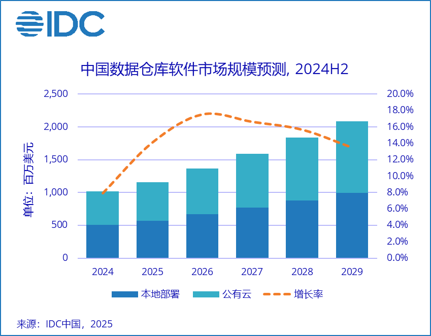 北京,2025年7月24日——国际数据公司(IDC)于近日发布了《2024年下半年中国数据仓库软件市场跟踪报告》。IDC数据显示,2024下半年中国数据仓库软件市场规模为5.5亿美元,同比增长8.7%。其中,本地部署数据仓库软件规模2.8亿美元,同比增长6.8%;公有云数据仓库软件规模2.6亿美元,同比增长10.9%。IDC预测, 到2029年,中国数据仓库软件市场规模将达到20.9亿美元,2024-2029的5年市场年复合增长率(CAGR)为15.5%。