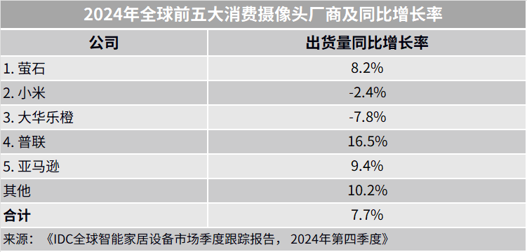 从厂商看,萤石蝉联消费摄像头出货量第一位置,小米、大华乐橙等依托家居生态及渠道优势加速出海,中国厂商当前在全球消费摄像头市场优势显著。