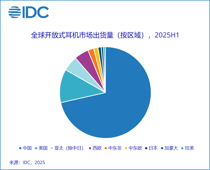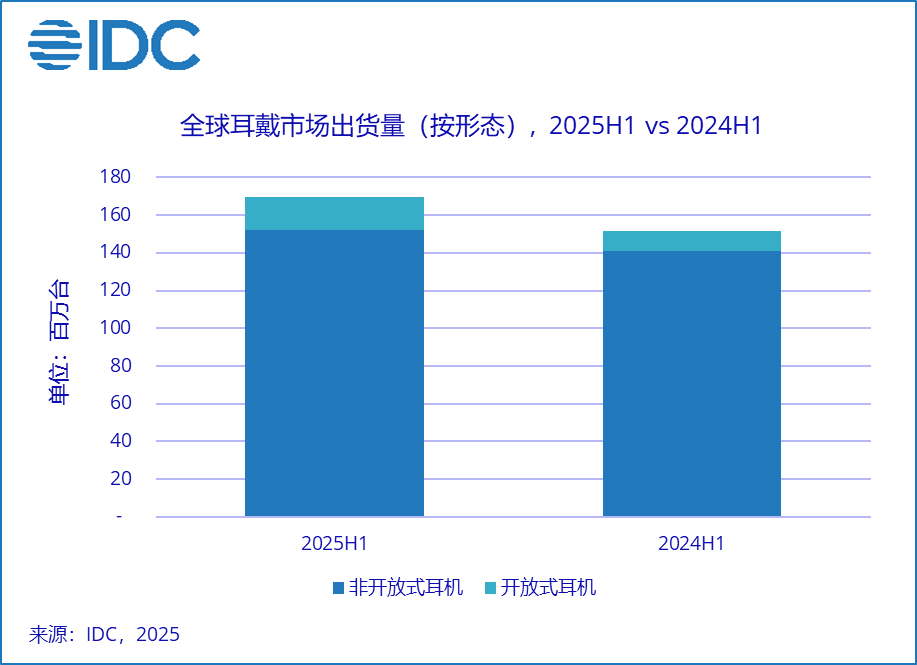 北京,2025年9月18日——IDC《全球可穿戴设备市场季度跟踪报告》数据显示,2025年上半年全球耳戴市场出货量1.7亿台,同比增长11.8%,其中开放式产品出货量占比10.1%,同比增长61.1%,其凭借新颖外观和新兴传导技术引领全球市场增速。