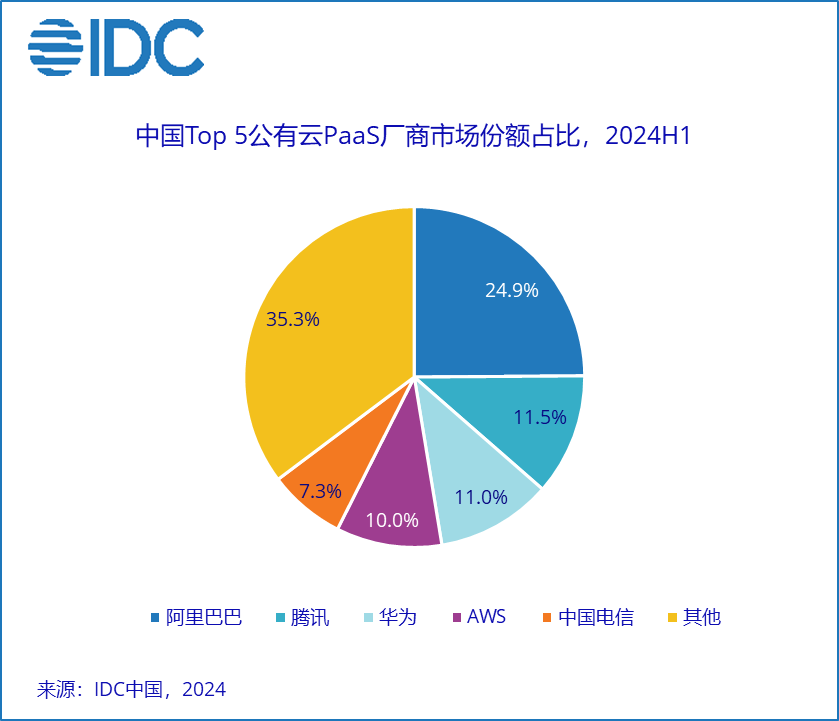 2024上半年PaaS市场中,阿里巴巴、腾讯、华为、AWS和中国电信为市场排名前五,市场份额总和64.7%,集中度同比下降1.7%。AI和出海需求的不断提升为PaaS市场带来更多发展空间,在一定程度上分散了市场集中度。
